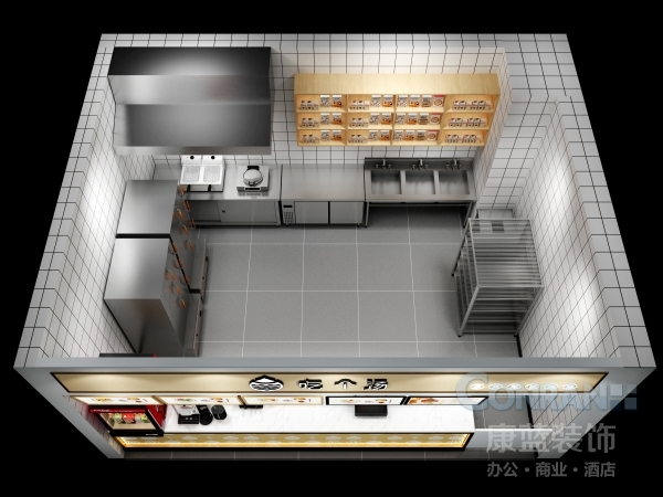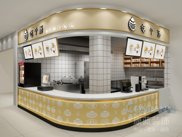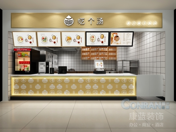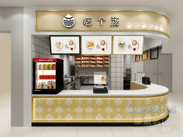 另外,廚房與顧客就餐的區(qū)域也應(yīng)該通過設(shè)計來輔助湯品的完美呈現(xiàn)??邓{(lán)將吃個湯的廚房打造成為一個半開放式的空間組合,以略帶弧形的兩面打開與顧客交流的空間。并為工作人員留下出口,方便隨時到顧客身邊服務(wù)。